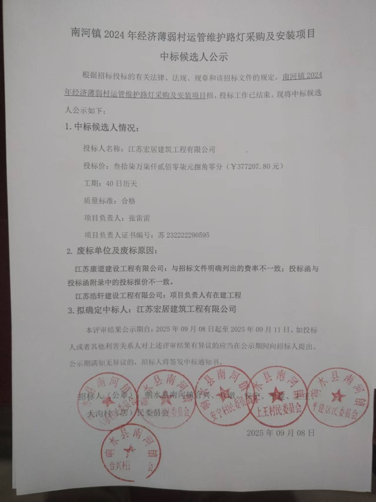 根据招标投标的有关法律、法规、规章和该招标文件的规定,南河镇2024年经济薄弱村运管维护路灯采购及安装项目招、投标工作已结束。现将中标候选人公示如下: