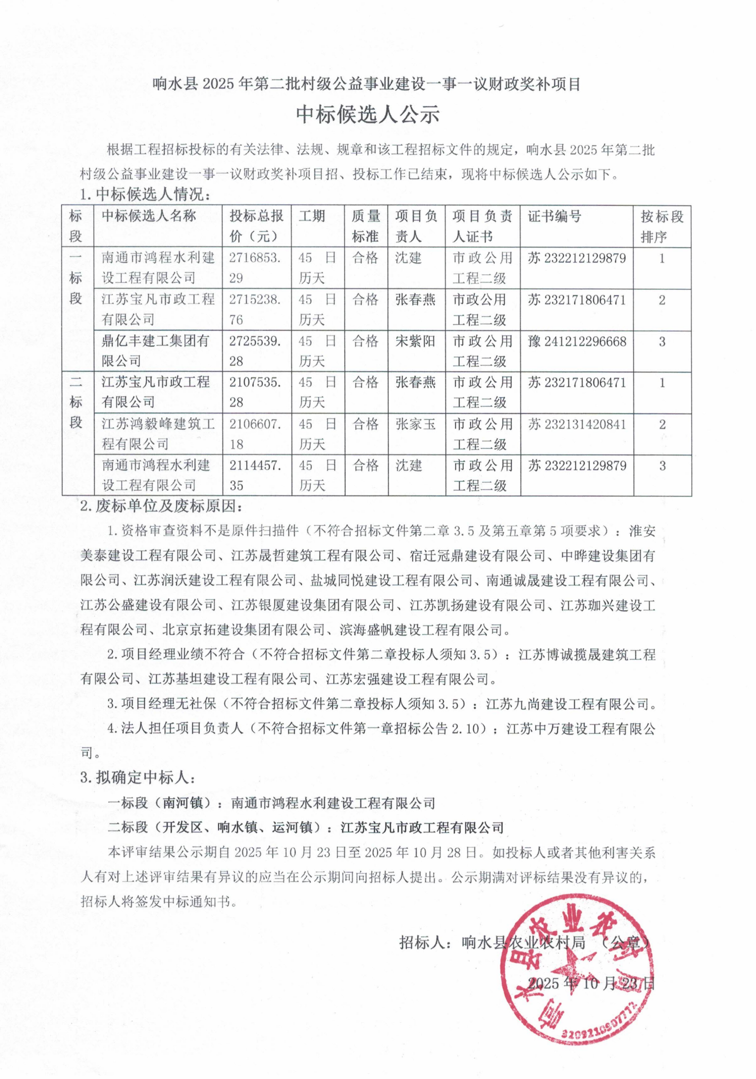 根据工程招标投标的有关法律、法规、规章和该工程招标文件的规定,响水县2025年第二批村级公益事业建设一事一议财政奖补项目招、投标工作已结束,现将中标候选人公示如下。