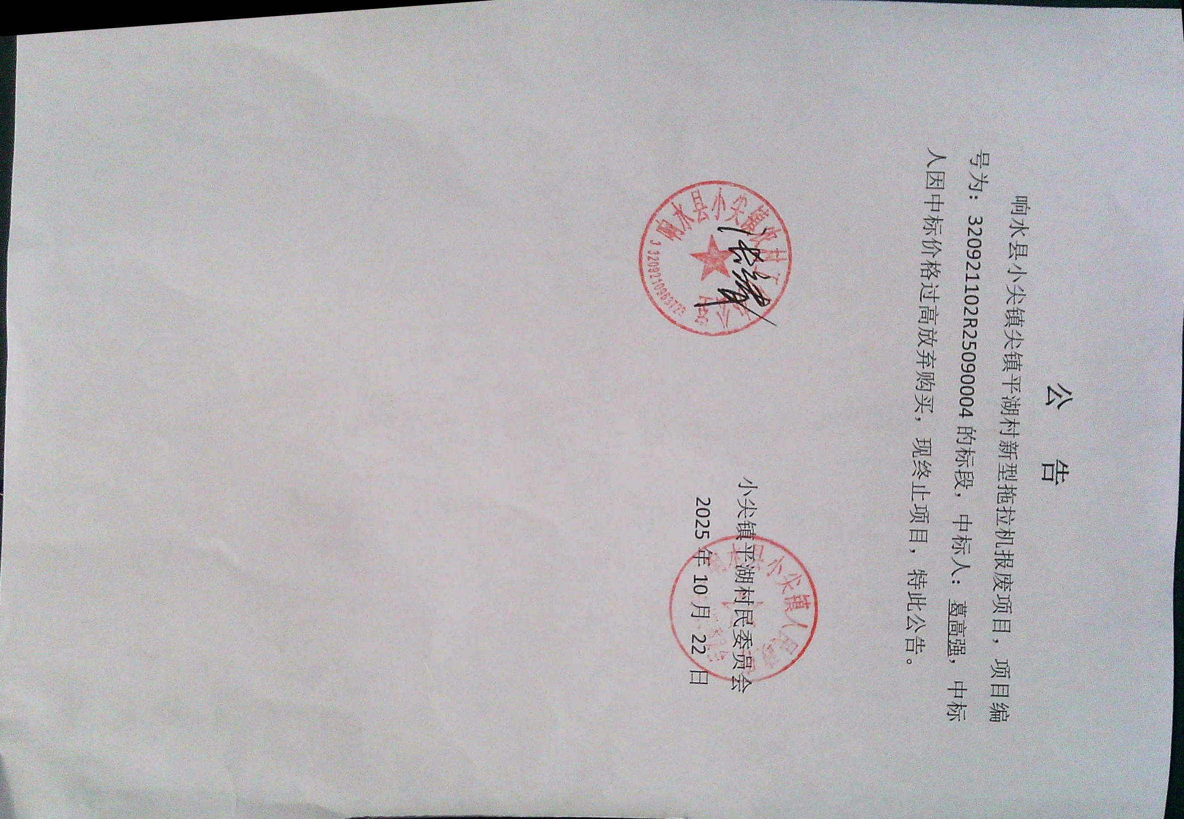 响水县小尖镇尖镇平湖村新型拖拉机报废项目,项目编号为:320921102R25090004的标段,中标人:葛高强,中标人因中标价格过高放弃购买,现终止项目,特此公告。