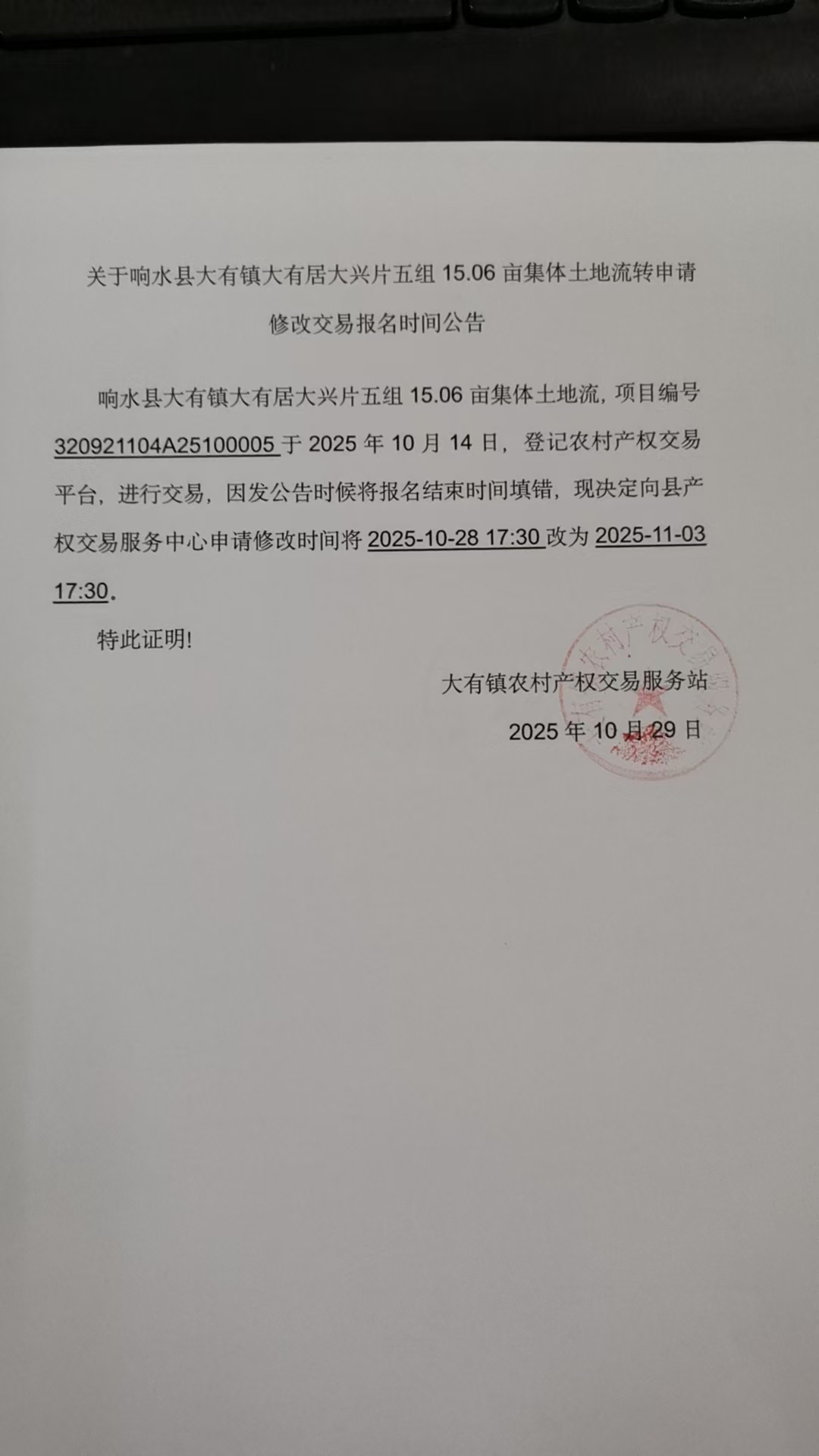 响水县大有镇大有居大兴片五组15.06亩集体土地流,项目编号320921104A25100005于2025年10月14日,登记农村产权交易平台,进行交易,因发公告时候将报名结束时间填错,现决定向县产权交易服务中心申请修改时间将2025-10-28 17:30改为2025-11-03 17:30。