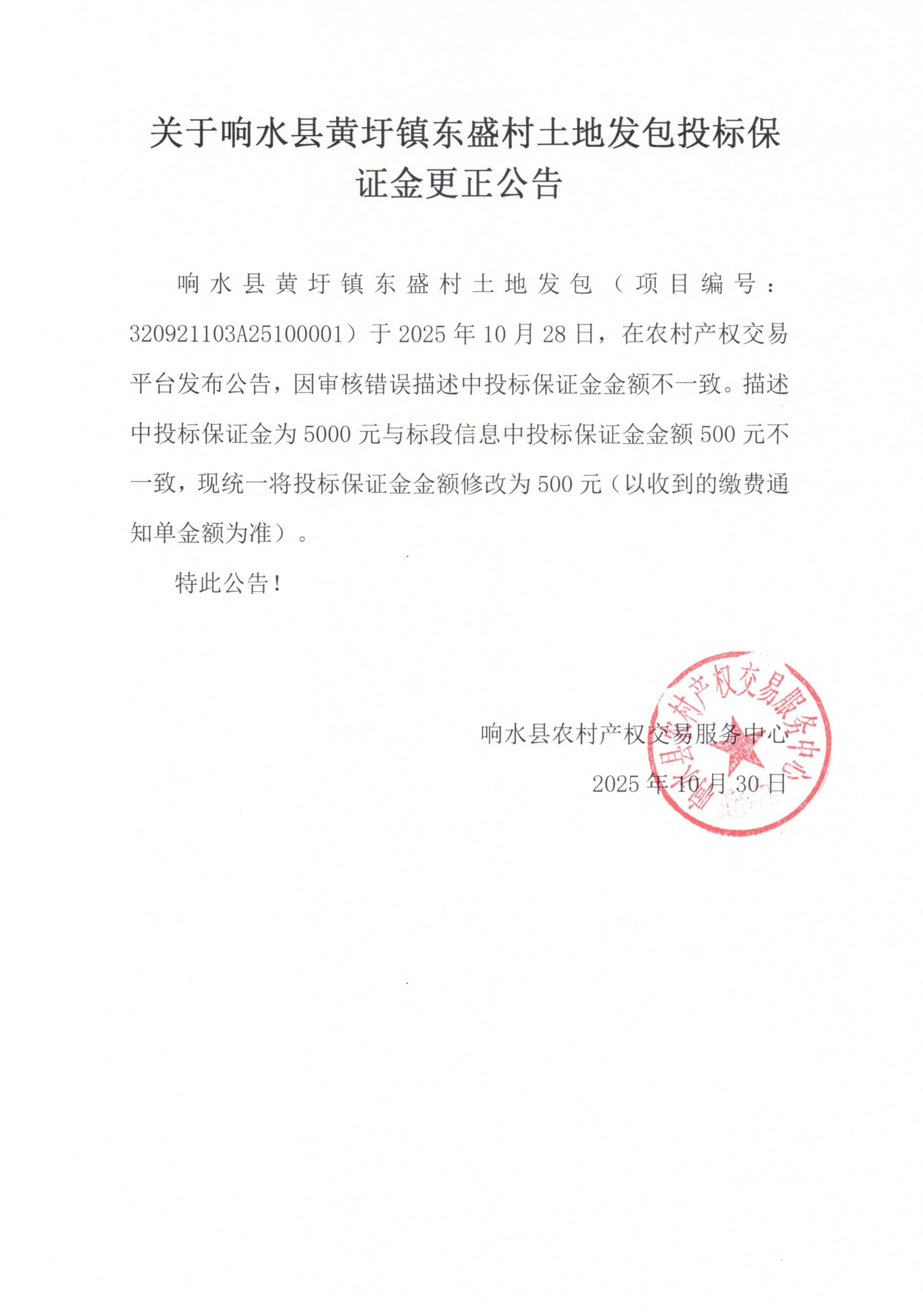 响水县黄圩镇东盛村土地发包(项目编号:320921103A25100001)于2025年10月28日,在农村产权交易平台发布公告,因审核错误描述中投标保证金金额不一致。描述中投标保证金为5000元与标段信息中投标保证金金额500元不一致,现统一将投标保证金金额修改为500元(以收到的缴费通知单金额为准)。