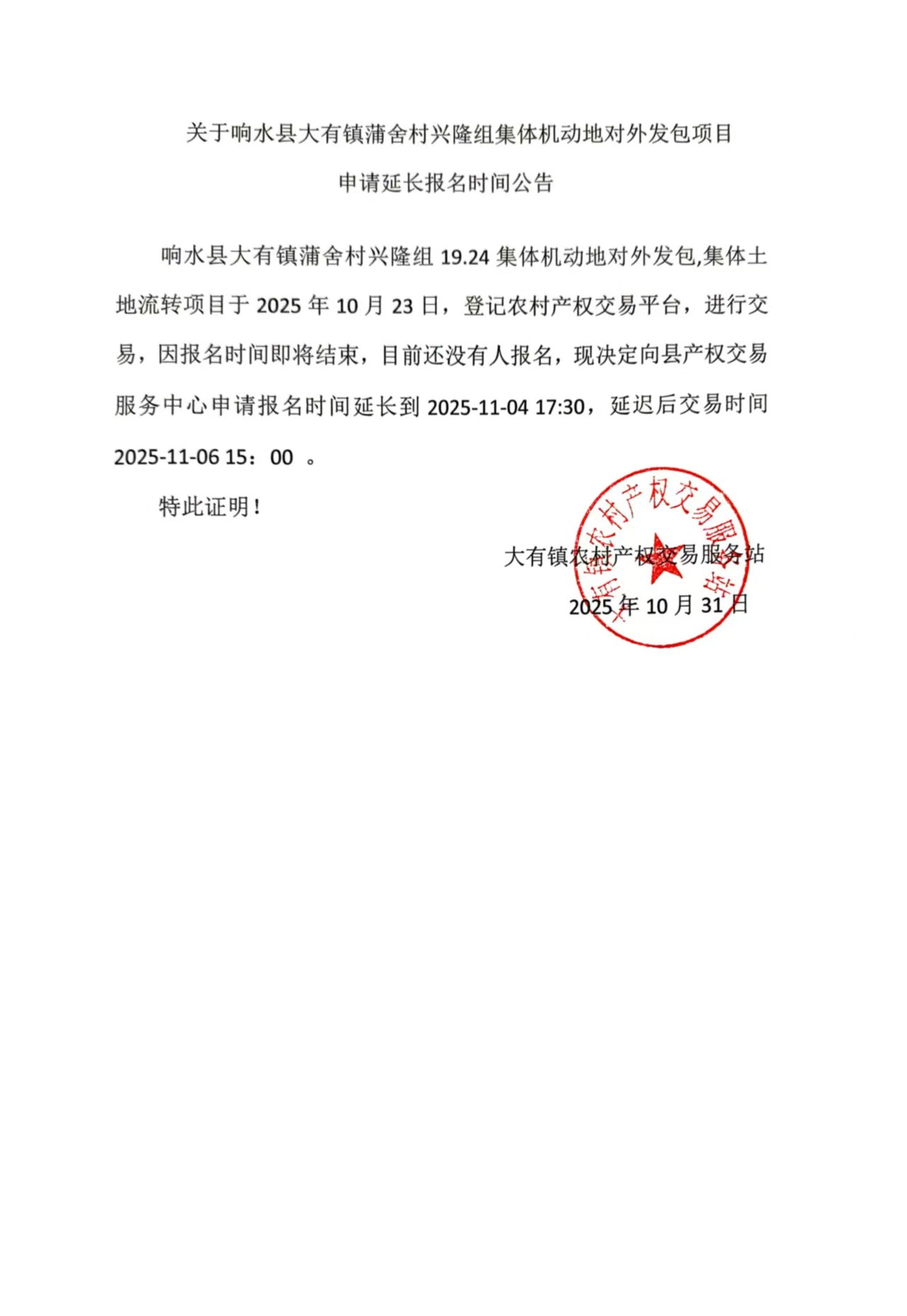 响水县大有镇蒲舍村兴隆组19.24集体机动地对外发包,集体土地流转项目于2025年10月23日,登记农村产权交易平台,进行交易,因报名时间即将结束,目前还没有人报名,现决定向县产权交易服务中心申请报名时间延长到2025-11-04 17:30,延迟后交易时间2025-11-06 15:00 。