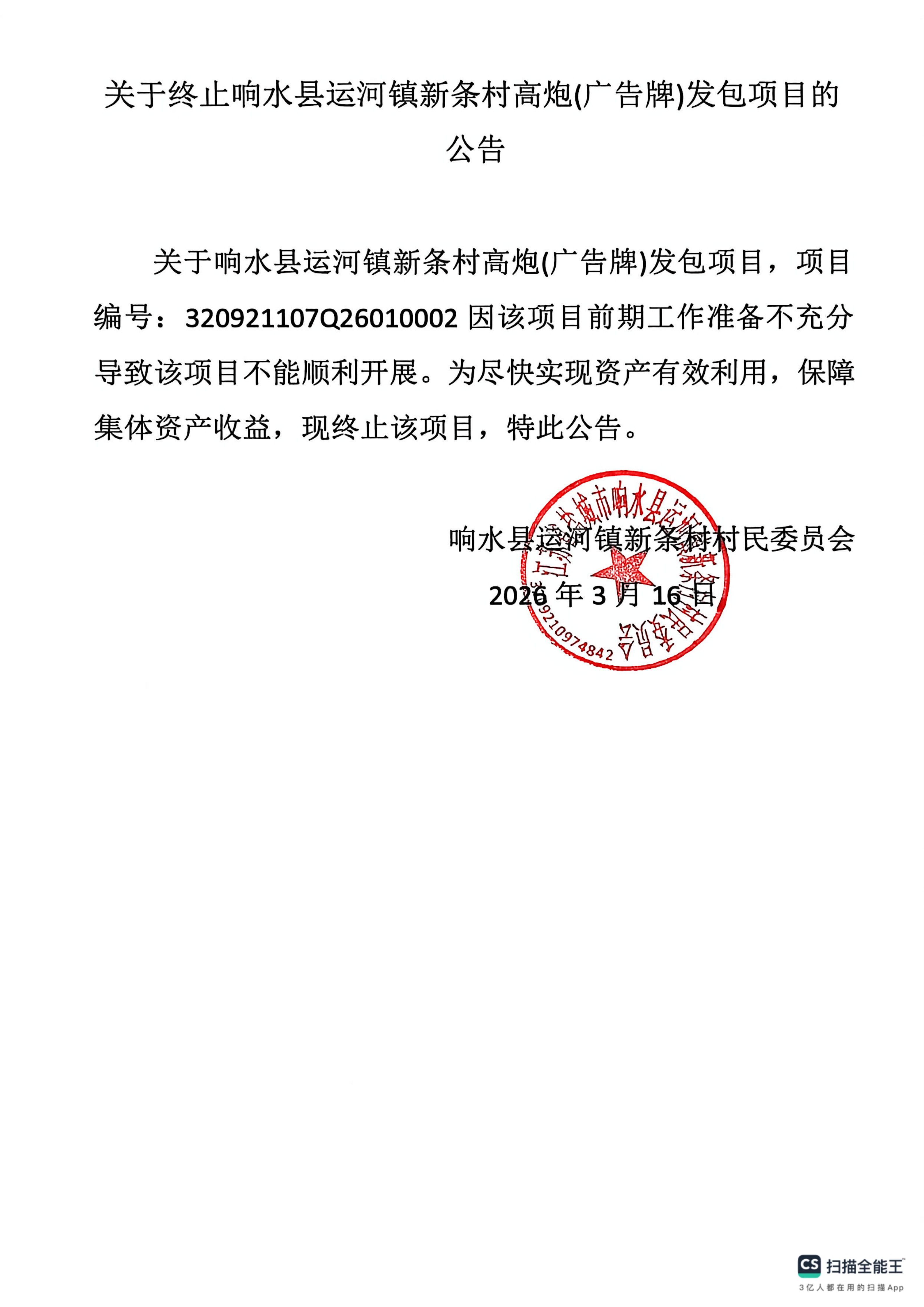关于终止响水县运河镇新条村高炮(广告牌)发包项目的公告